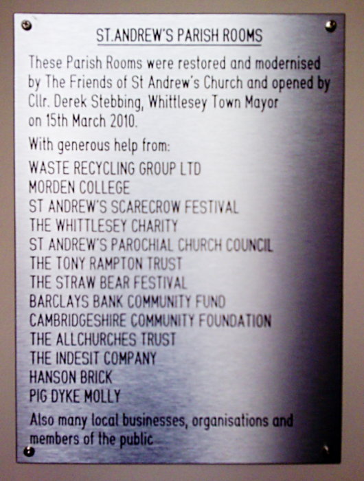 Plaque, St Andrews HallSt Andrew's Hall, Whittlesea was extensively refurbished with the aid of contributions from many local businesses and organisations. Pig Dyke have their annual Straw Bear Friday show there and occasionally use it for other things.